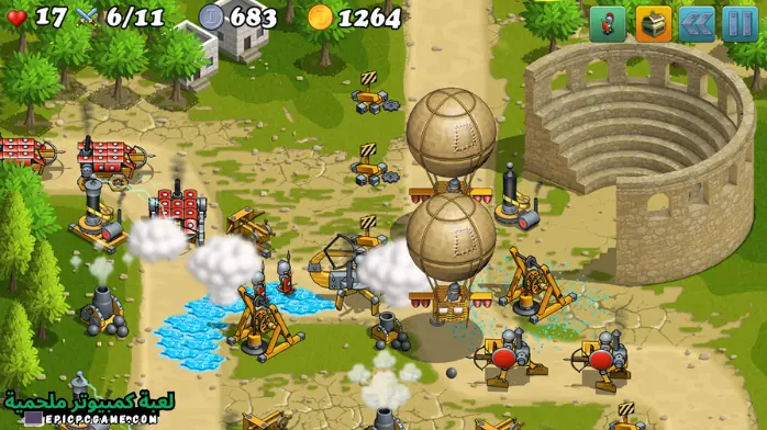 بعد تحميل لعبة دفاع اليونان كاملة للكمبيوتر يمكنك تغيير أماكن المعدات وآلات الحرب بدون حد أقصى. استمر في التجربة والتبديل بعد تنزيل لعبة دفاع اليونان للكمبيوتر حتى تصل إلى أفضل توزيع بحيث تحقق أقصى قدر ممكن من الدفاع. تمنحك الألعاب الحربية مساحة أرض كبيرة جدًا، مما يسمح لك ببناء عدد هائل من الدفاعات، مما يمنحك الفرصة لتأمين كافة المداخل والمخارج وتحصينها بشكل سليم دون ترك أي ثغرات أو نقاط ضعف.